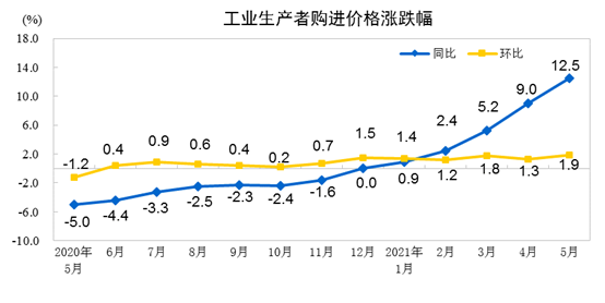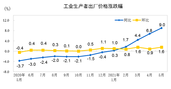 2021年5月份,全国工业生产者出厂价格同比上涨9.0%,环比上涨1.6%;工业生产者购进价格同比上涨12.5%,环比上涨1.9%。1—5月平均,工业生产者出厂价格比去年同期上涨4.4%,工业生产者购进价格上涨5.9%。